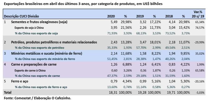 - Em abril, as exportações brasileiras de carne para a China subiram 65%, na comparação com abril de 2019.