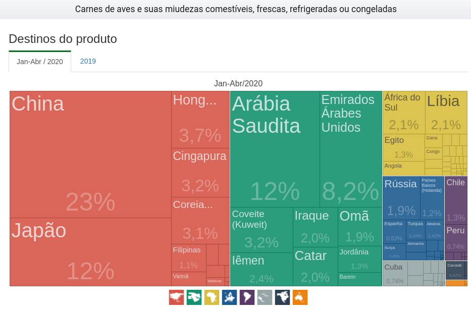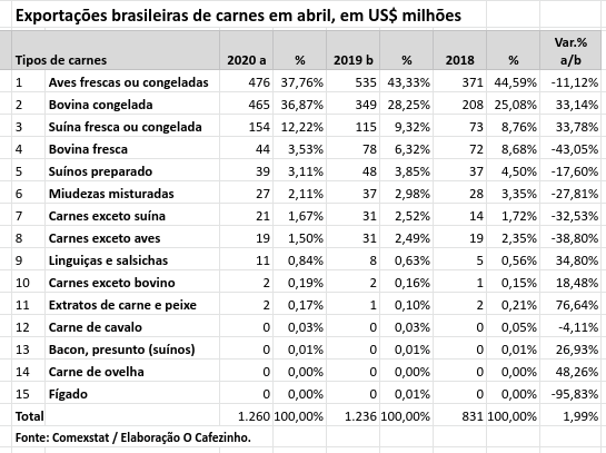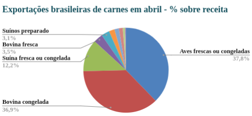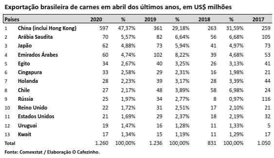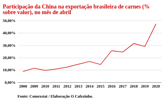 - Com isso, a participação da China nas exportações brasileiras de carnes em geral alcançou 47% em abril deste ano, contra 29% em abril de 2019.