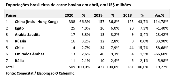 - Considerando apenas a carne bovina, as exportações para a China aumentaram 115% em abril!