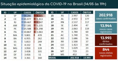 Já os novos casos confirmados foram 13.944, totalizando 202.918. Foi o maior número de casos confirmados registrados em 24 horas desde o início da pandemia no país. O resultado marcou um acréscimo de 7,3% em relação a ontem, quando o número de pessoas infectadas estava em 188.974.
