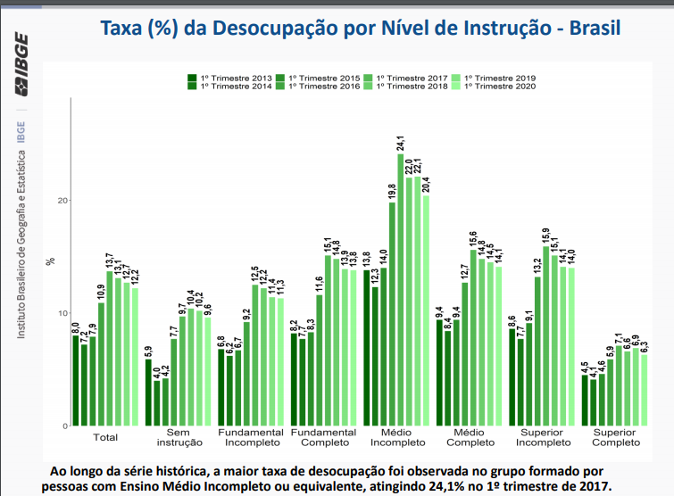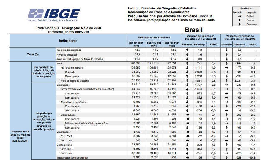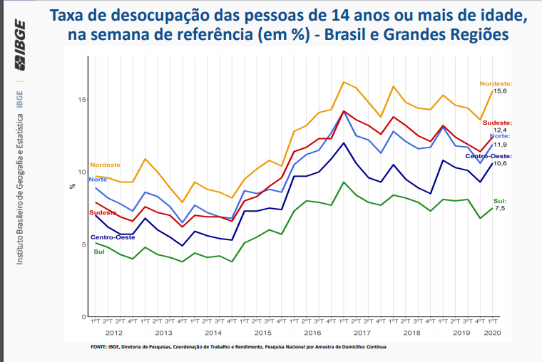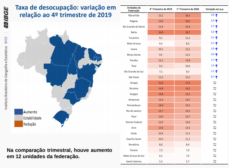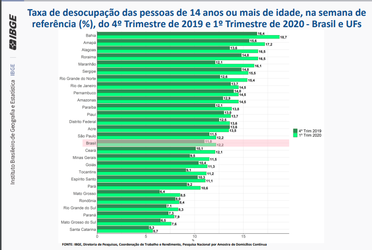 Em 15 unidades da federação, o desemprego superou a média nacional, de 12,2%. O país tinha 12,9 milhões de pessoas sem trabalho no primeiro trimestre, conforme já divulgado pelo Instituto.