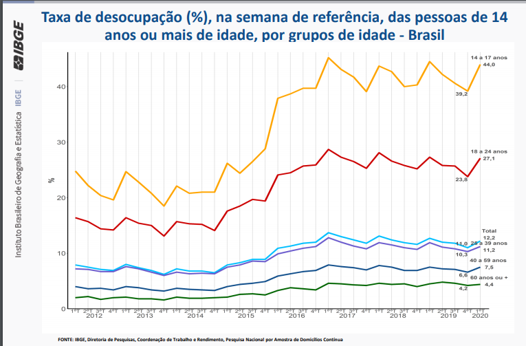 Entre os jovens de 18 a 24 anos de idade, o desemprego passou de 23,8%, no último trimestre de 2019, para 27,1%. No Nordeste, o desemprego para essa faixa etária chegou a 34,1%. De acordo com a analista da pesquisa, Adriana Beringuy, é esperado haver no primeiro trimestre um aumento da desocupação, devido às dispensas dos trabalhadores temporários contratados no final do ano.