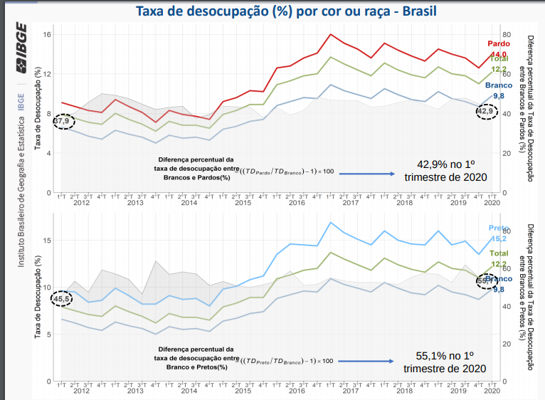 A pesquisa aponta também que as desigualdades permaneceram acentuadas em diversos segmentos da sociedade no primeiro trimestre do ano. Entre as pessoas que se declararam pretas e pardas, o desemprego avançou, de 13,5% e 12,6%, no quarto trimestre, para, respectivamente, 15,2% e 14%, enquanto o das brancas subiu de 8,7% para 9,8%. A taxa de desocupação foi estimada em 10,4% para os homens e 14,5% para as mulheres.