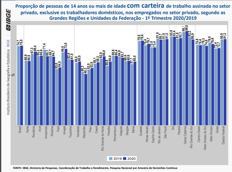 Embora a taxa de informalidade tenha se mantido estável em 18 estados, ela ficou acima da taxa média nacional (39,9%) nesses locais, variando de 41,2%, em Goiás, até 61,4% no Pará. Em 11 desses 18 estados, a informalidade ultrapassou 50% e apenas Distrito Federal (29,6%) e Santa Catarina (27,3%) tiveram taxas de informalidade abaixo de 30%.