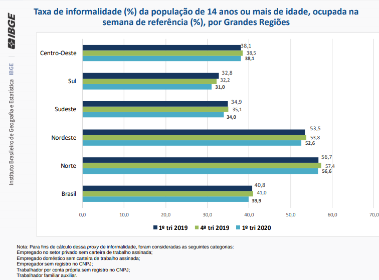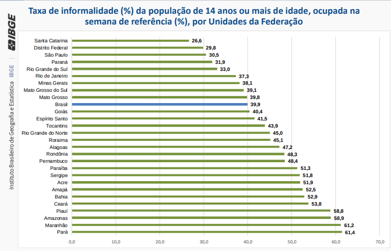 A taxa de informalidade passou de 41% para 39,9% no país e, entre as unidades da federação, as maiores taxas foram registradas no Pará (61,4%) e Maranhão (61,2%) e as menores em Santa Catarina (26,6%) e Distrito Federal (29,8%).