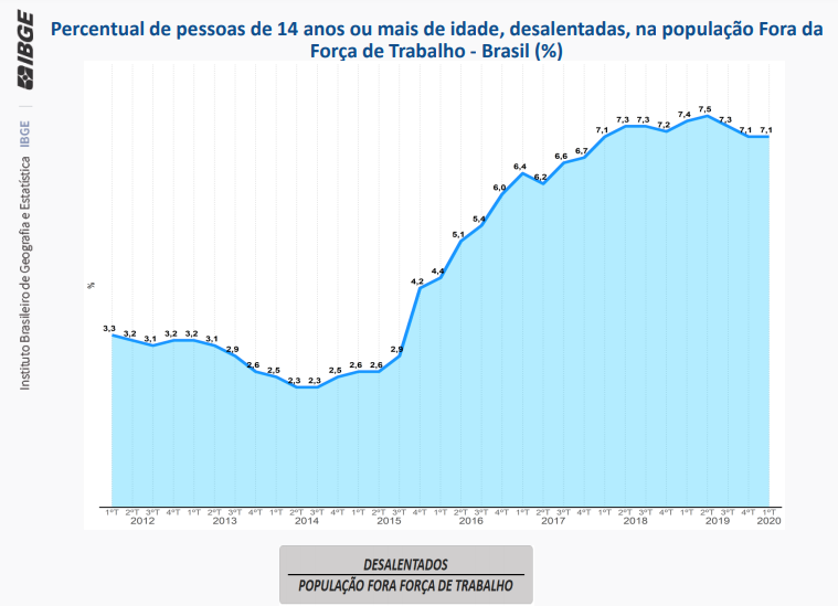 O número de desalentados foi de 4,8 milhões de pessoas, com destaque para a Bahia (774 mil), que respondia por 16,3% do contingente nacional. O percentual de pessoas desalentadas (em relação à população na força de trabalho ou desalentada) no primeiro trimestre de 2019 foi de 4,3%, crescendo 0,2% na comparação com o quarto trimestre de 2019 e estável em relação ao primeiro trimestre de 2019. Maranhão (17,8%) e Alagoas (15,5%) tinham os maiores percentuais e Santa Catarina (0,8%) e Rio de Janeiro (1,2%), os menores.