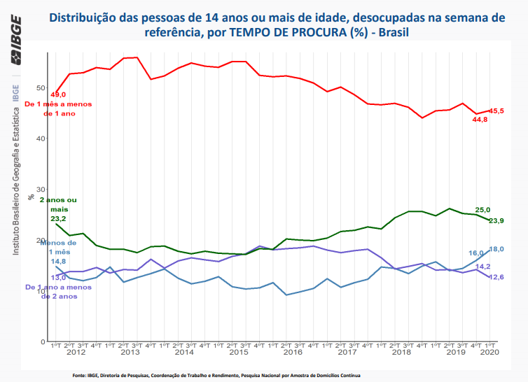 Em relação ao tempo de procura por emprego, a pesquisa mostra que 45,5% dos desocupados estavam de um mês a um ano em busca de trabalho; 23,9%, há dois anos ou mais; 12,6%, de um ano a menos de dois anos; e 18%, há menos de um mês. No país, 3,1 milhões de pessoas procuram trabalho há 2 anos ou mais.