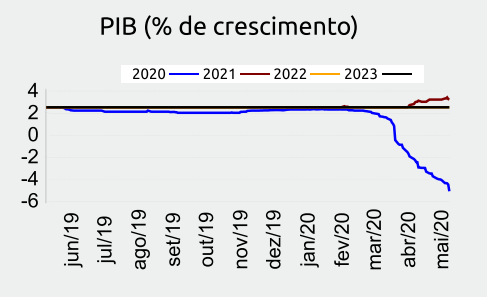 O mercado financeiro continua a revisar a estimativa de queda da economia neste ano. Pela 14ª semana seguida, piorou a expectativa do mercado financeiro para o recuo do Produto Interno Bruto (PIB) – a soma de todos os bens e serviços produzidos no país. Desta vez, a previsão de queda passou de 4,11% para 5,12%.