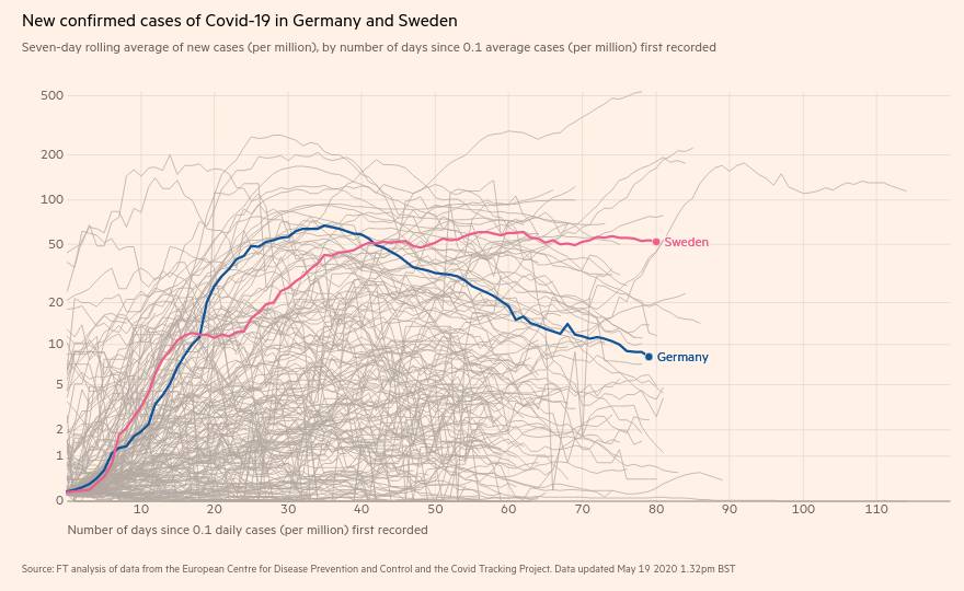 O gráfico acima traz o número novos de casos para Suécia e Alemanha, por milhão de habitantes. Nele, o declínio da curva alemã é evidente, ao passo que a Suécia não conseguiu, até o momento, domesticar a disseminação do vírus no país, que apresenta a taxa mais alta da Europa, em termos per capita.