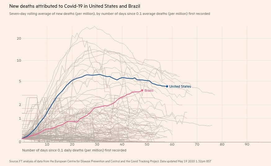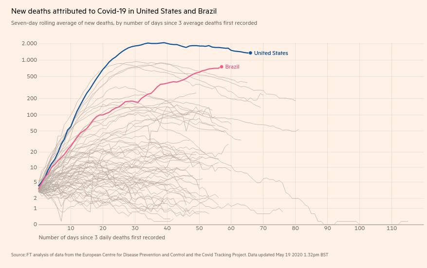 As duas linhas começam pela marca das primeiras 3 mortes registradas, então é possível comparar a evolução da doença em ambos os países. Enquanto nos EUA, vemos uma curva achatada e já declinante, a do Brasil continua a subir dramaticamente.