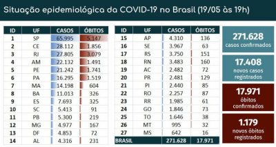 O balanço diário do Ministério da Saúde registrou também recorde de novos casos confirmado em 24 horas, com 17.408. No total, 271.628 pessoas foram infectadas. O resultado marcou um acréscimo de 6,8% em relação a ontem, quando o número de pessoas infectadas estava em 254.220.