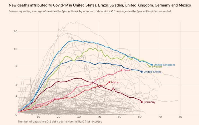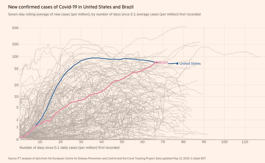 Com dados atualizados até o dia 20 (ou seja, já estão um pouco desatualizados, pois ontem houve número recorde de mortes), o jornal mostra que o Brasil chegou a 4,1 mortes diárias por milhão de habitantes, enquanto os EUA, cujo pico foi em 20 de abril (quando chegou a 6,4 mortes por milhão de habitantes), reduziu sua taxa de mortalidade diária por Covid, por milhão de habitantes, para 3,8 mortes.