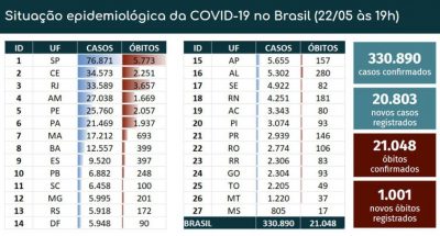 Agência Brasil — O Brasil registrou 1.001 novas mortes, chegando ao total de 21.048. O resultado representou um aumento de 4,9% em relação a ontem(21), quando foram contabilizados 20.047 mil falecimentos por covid-19. Os números foram divulgados no balanço do Ministério da Saúde divulgado hoje (22).