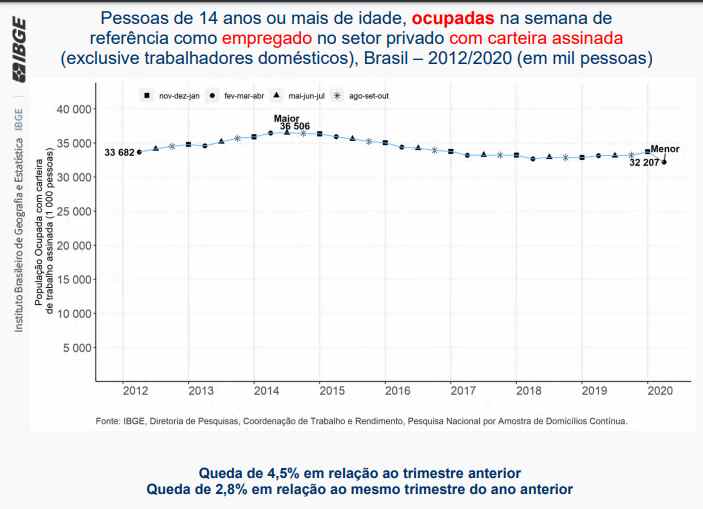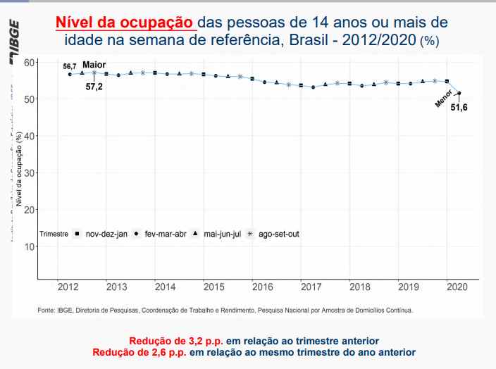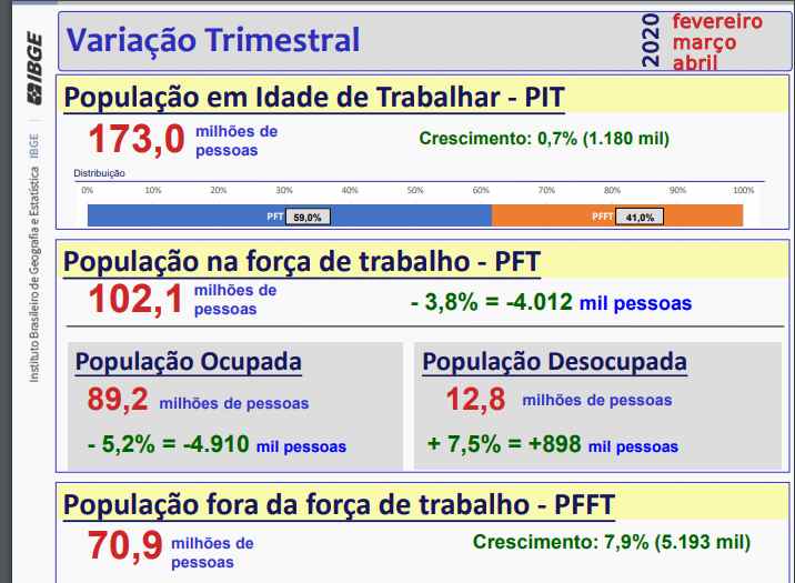 Um indicador que reflete os efeitos da pandemia de Covid 19 no mercado de trabalho, a população ocupada teve queda recorde de 5,2%, em relação ao trimestre encerrado em janeiro, representando uma perda de 4,9 milhões de postos de trabalho, que foram reduzidos a 89,2 milhões.