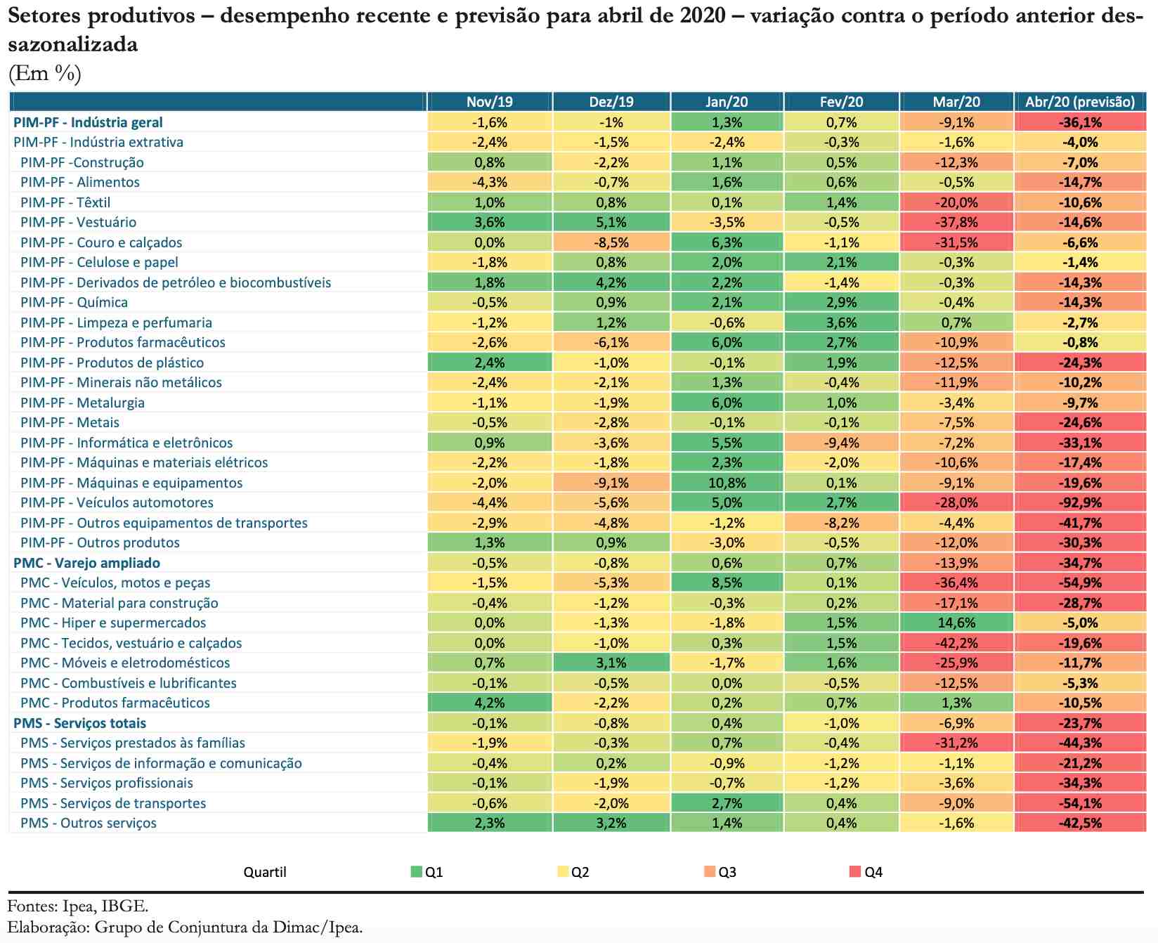 O setor mais atingido até agora é a indústria, cujo destaque negativo em março foi a produção total de automóveis (-95%). A previsão do Ipea aponta para uma retração de 36,1% em abril, em relação ao mês anterior.