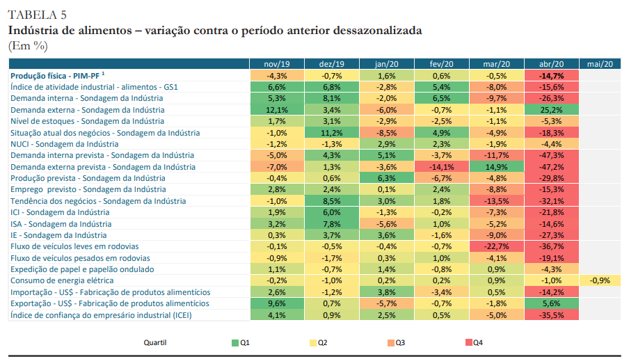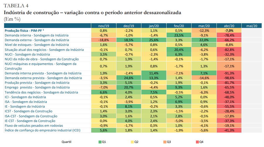 O boletim apresenta uma projeção detalhada por segmento para o mês de abril, cujos dados ainda não estão divulgados. A indústria alimentícia, que cresceu 0,5 % em março, tem previsão de queda de -14,7%. A produção de derivados de petróleo e biocombustíveis, que já havia recuado em março (-0,3%), despencaria para -14,3% – mesmo índice previsto para artigos químicos (que caíram -4,7% em março). O crescimento em março nos setores de produção de celulose e papel (0,3%) e artigos de limpeza e perfumaria (0,7%) também deve ser revertido em abril, com queda de 1,4% e 2,7% respectivamente.