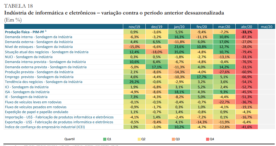 A fabricação de produtos de borracha e plástico (-12,5% em março) deve cair para -24,3% em abril, mesmo movimento da metalurgia (-3,4% em março e -9,7% em abril), e da fabricação de equipamentos de informática e produtos eletrônicos (-7,2% em março e -33,1% em abril). A produção de máquinas, aparelhos e materiais elétricos, que teve queda expressiva de -10,6% em março, deve recuar ainda mais em abril (-17,4%). Seguem essa tendência a produção de máquinas e equipamentos (de -9,1% para -19,6%), outros equipamentos de transporte (-4,4% para -41,7%) e outros produtos manufaturados (-0,3% para -30,3%). Um dos mais afetados em março foi o segmento de veículos automotores, reboques e carrocerias (- 28%), com projeção de queda da produção de expressivos -92,9% em abril.