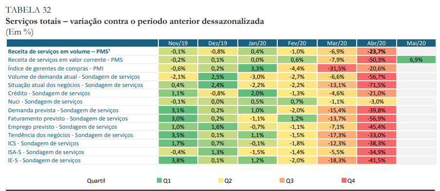 No comércio varejista, a piora deve ser disseminada, com as vendas encolhendo 34,7% entre os meses de março e abril. O setor de serviços também foi severamente impactado pela pandemia – apenas o segmento de tecnologia, informação e comunicação deve recuar -21,2% no período. O Ipea prevê redução de 23,7% para o indicador PMS (Pesquisa Mensal de Serviços, do IBGE) de abril.