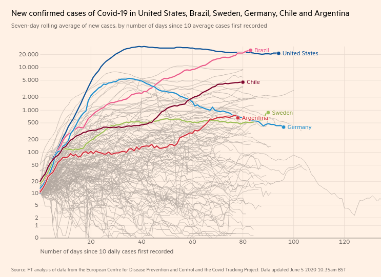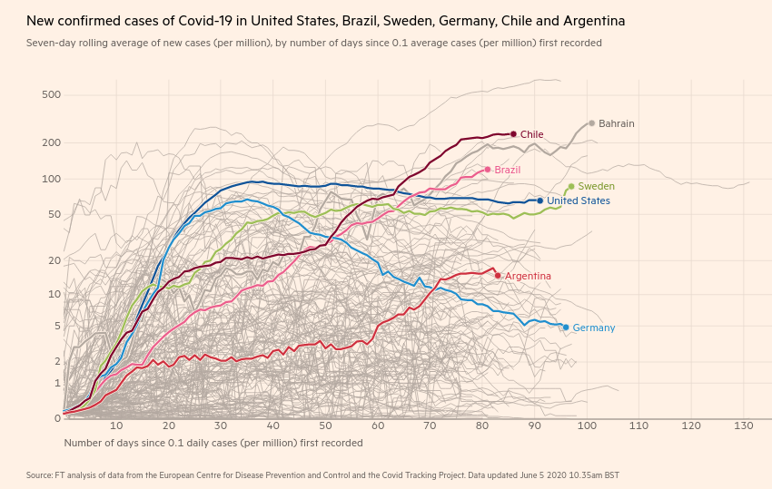 Os números do Financial Times usam dados atualiados até o dia 3 de junho. Não consideraram, portanto, o registro recorde de ontem, dia 4 de junho, quando o Ministério da Saúde informou o óbito de quase 1.500 brasileiros nas últimas 24 horas, vítimas do novo coronavírus.