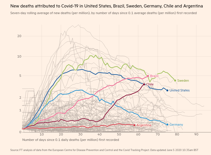 Em mortes por milhão de habitantes, o Brasil figurava atrás apenas da Suécia, até poucos dias atraś campeão global nesse quesito. Mas agora o Brasil assumiu o primeiro lugar no mundo, com 5 mortes diárias por milhão de habitantes, contra 4,2 mortes diárias na Suécia e 2,7 mortes diárias nos EUA.