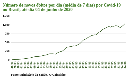 Em números absolutos, superamos os Estados Unidos. Enquanto a média diária no Brasil, nos últimos 7 dias, chegou a 1.038 óbitos, até o dia 03 de junho, a curva de mortes nos EUA, que chegou a atingir 2 mil por dia, vem se achatando e declinando há várias semanas, e hoje está em 902 mortos por dia.