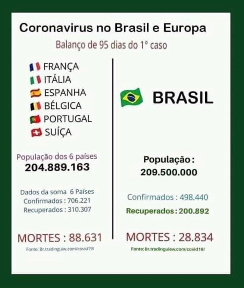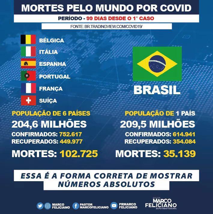 Os bolsonaristas estão espalhando uma nova fake news por aí, na qual comparam as mortes somadas por Covid-19 em seis países europeus duramente atingidos (Itália, Espanha, França, Portugal, Suíça e Bélgica), com as mortes totais no Brasil, até agora.