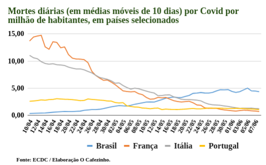 A curva de óbitos diários no conjunto de seis países atingiu o ápice no dia 38 a partir da décima morte. No Brasil, nessa mesma época da evolução do Covid, a quantidade de mortes era bem menor.