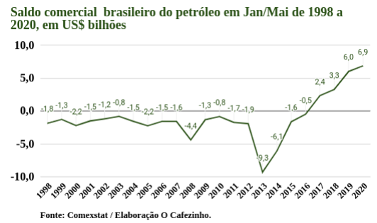 Entretanto, o petróleo, mesmo tendo perdido valor por causa do declínio dos preços, ainda assim teve um desempenho importante para nossa balança. Como as importações também caíram muito, o saldo comercial do petróleo atingiu um recorde histórico, quase 7 bilhões de dólares. O Brasil é um país com uma história muito longa de déficits de sua balança comercial de petróleo, situação que apenas foi revertida a partir de 2016, quando o pré-sal começa a fazer diferença.