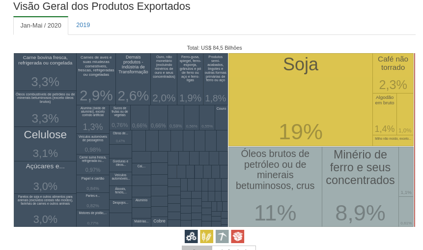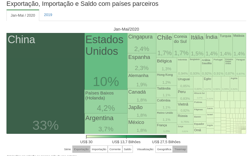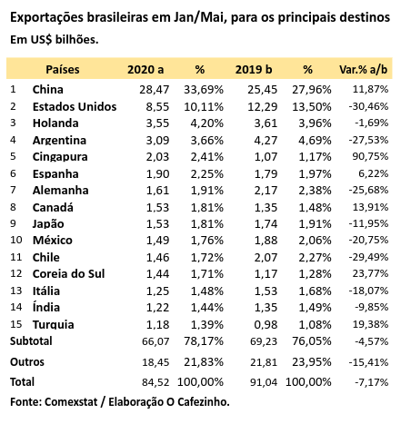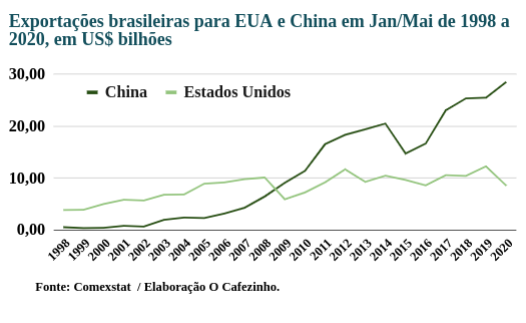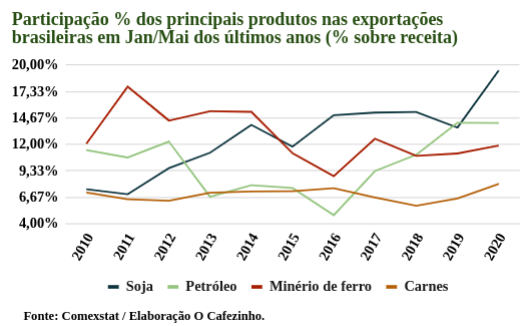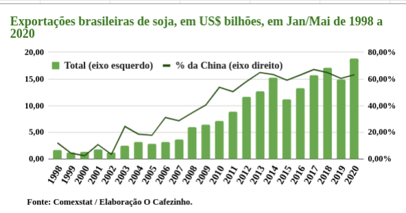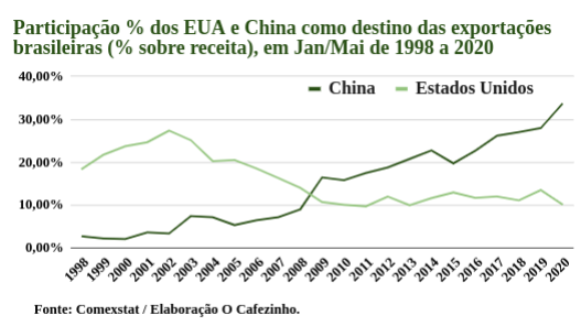Segundo o Comexstat, as exportações brasileiras para a China nunca foram tão grandes. Enquanto as exportações brasileiras totais, em jan/mai de 2020, caíram 7%, as vendas para a China subiram 12%, fazendo com que a participação chinesa nas exportações brasileiras totais chegasse a 34%, um recorde histórico.
