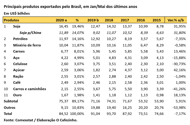 Quanto aos produtos exportados, o grande destaque foi a soja, cujo embarque cresceu 32% em Jan/Mai deste anos, puxado pelas compras chinesas.
