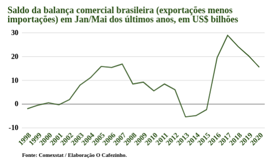 Em termos de saldo comercial, o peso da China para o comércio exterior brasileiro é impressionante. Em Jan/Mai 2020, o saldo da balança comercial brasileira ficou em 16 bilhões de dólares, o menor em cinco anos, para o mesmo período. Mas apenas o saldo obtido com a China este ano ficou em 13 bilhões de dólares, ao passo que o Brasil registrou déficit comercial de 3 bilhões de dólares com os EUA, o maior em seis anos.