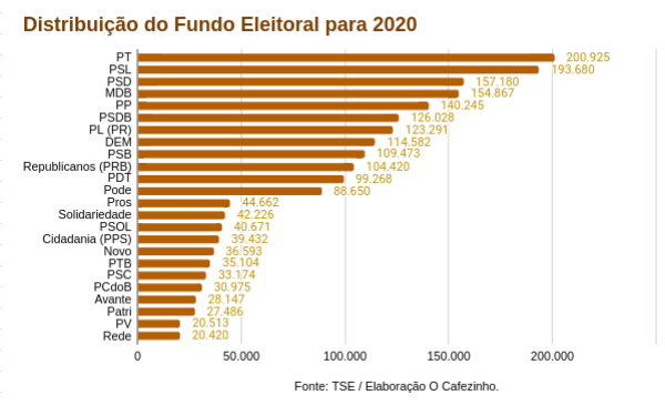 Foi divulgada nesta segunda-feira (8) a distribuição dos valores aos quais 32 dos 33 partidos políticos registrados na Corte terão direito do total de R$ 2.034.954.824,00 de recursos do Fundo Especial de Financiamento de Campanha (FEFC), também conhecido como Fundo Eleitoral. A publicação, que ocorrerá na edição do Diário de Justiça Eletrônico do Tribunal Superior Eleitoral (DJe/TSE) desta terça-feira (9), atendeu à determinação do presidente do Tribunal, ministro Luís Roberto Barroso.
