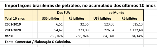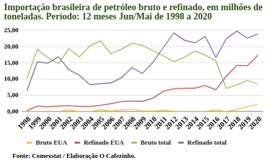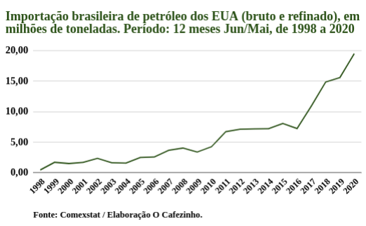 As importações de petróleo com origem nos EUA, que até 2016, nunca haviam correspondido a mais de 20% de nossas compras externas de petróleo, começam a subir vertiginosamente, e hoje o país responde por cerca de 60% de todo o petróleo importado pelo Brasil. Considerando apenas os derivados, os EUA detêm hoje mais de 80% das nossas importações!