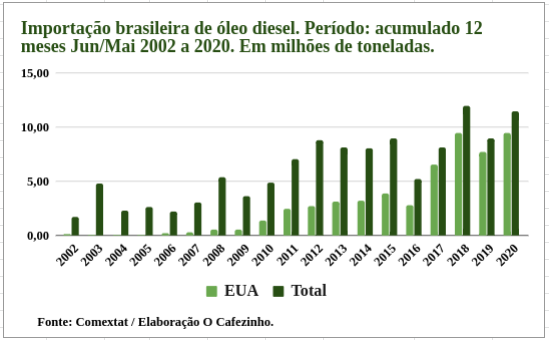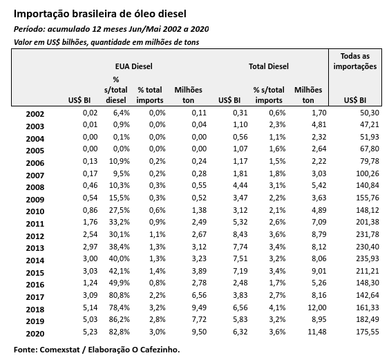 Nos últimos 12 meses, o Brasil importou US$ 5,23 bilhões de diesel dos EUA, um recorde histórico.
