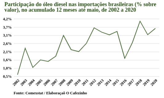 Nos últimos 12 meses até maio, o Brasil importou US$ 6,23 bilhões em óleo diesel, ou 11,48 milhões de toneladas. Nos anos de 2011 a 2015, importamos de 7 a 8 bilhões de dólares por ano em diesel, mas esses valores refletem os preços altos da época. Em quantidade, nossa importação no acumulado de 12 meses até maio foi a segunda maior da história, apenas superada no período jun/mai 2018, quando chegou a 12 milhões de toneladas.