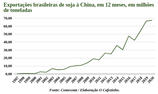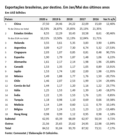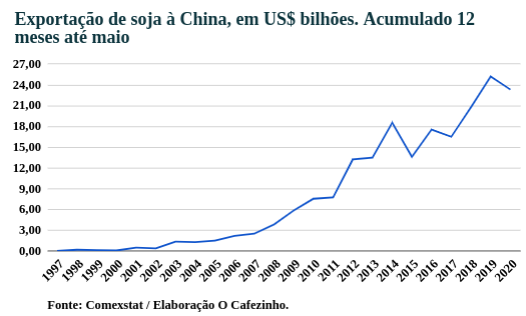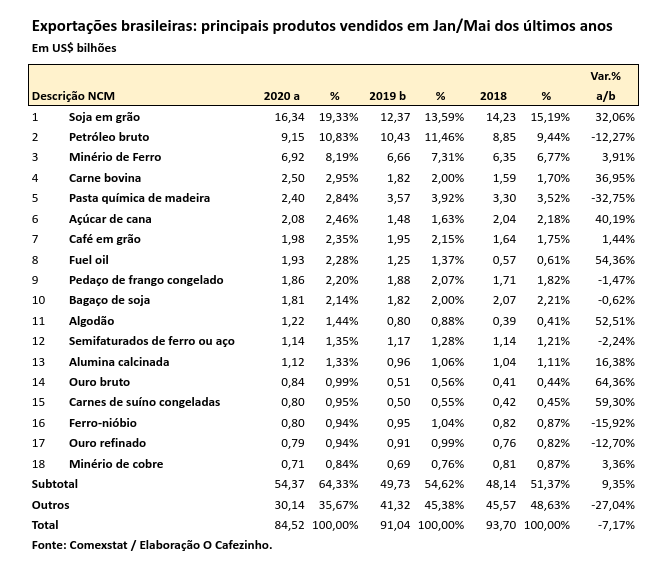 Na pauta de exportação, o destaque fica com a soja, cuja exportação nos cinco primeiros meses do ano chegou a US$ 16,3 bilhões, ou 19,3% de tudo que foi exportado pelo Brasil no período. Esse aumento foi inteiramente puxado pelo aumento de compras da China.
