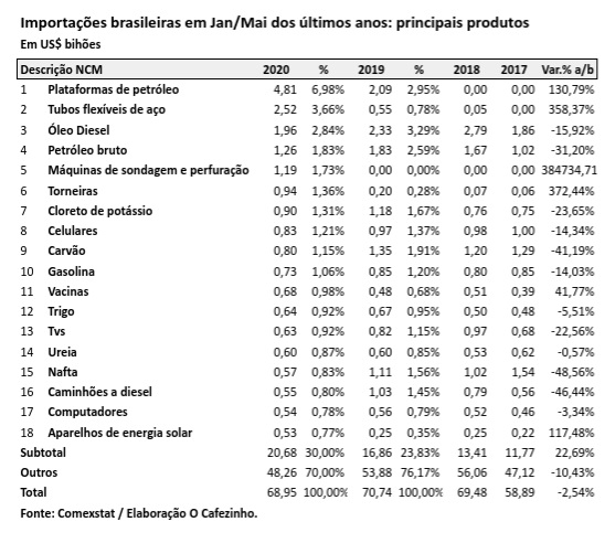 Entretanto, o este saldo é neutralizado pela importação de itens como plataformas de exploração e sondas de perfuração: no acumulado dos cinco primeiros meses do ano, o Brasil importou 4,81 bilhões de dólares em plataformas e 1,19 bilhão de dólares em sondas.