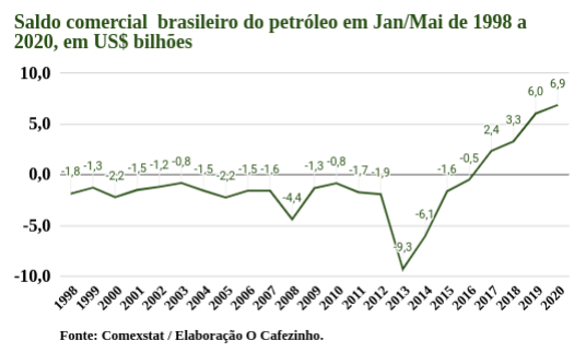 O saldo da balança comercial do petróleo (ou seja, a exportação menos a importação de todos os produtos de petróleo) no acumulado dos cinco primeiros meses do ano (jan/mai) bateu recorde, chegando a quase 7 bilhões de dólares.