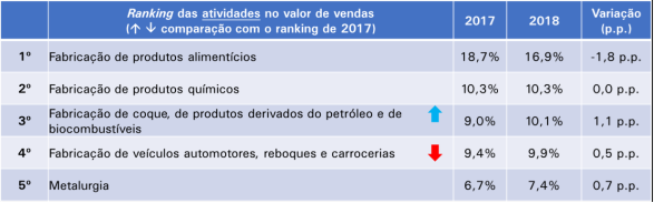 Em relação a 2017, os setores industriais que mais ganharam participação nas vendas foram coque, produtos derivados do petróleo e biocombustíveis (1,1 ponto percentual), extração de petróleo e gás natural (0,9 p.p.), metalurgia (0,7 p.p.), veículos automotores, reboques e carrocerias (0,5 p.p.) e extração de minerais metálicos (0,3 p.p.). Já as atividades que mais perderam participação foram produtos alimentícios (-1,8 ponto percentual), bebidas (-0,3 p.p.), outros equipamentos de transporte (-0,2 p.p.), confecção de artigos do vestuário e acessórios (-0,2%) e produtos de borracha e de material plástico (-0,2%).