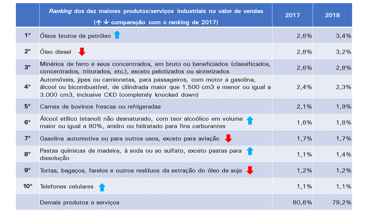 No ranking dos dez maiores produtos em relação às vendas de 2018, o grupo dos óleos brutos de petróleo liderou com vendas de R$ 88,5 bilhões e participação de 3,4% no total. Em seguida estão óleo diesel (R$ 82,4 bilhões e 3,2% de participação), minérios de ferro (R$ 72,2 bilhões e 2,8%), automóveis, com motor a gasolina, álcool ou bicombustível, de 1.500 a 3.000 cilindradas (R$ 61,4 bilhões e 2,3%), carnes de bovinos frescas ou refrigeradas (R$ 50,4 bilhões e 1,9%), etanol não desnaturado para fins carburantes (R$ 47,7 bilhões e 1,8%), gasolina automotiva (R$ 45,6 bilhões e 1,7%), pastas químicas de madeira (celulose) (R$ 37,1 bilhões e 1,4%), tortas, bagaços, farelos e outros resíduos da extração do óleo de soja (R$ 32,0 bilhões e 1,2%) e telefones celulares (R$ 29,1 bilhões e 1,1%). Os dez maiores produtos, em conjunto, representaram 20,8% do valor das vendas em 2018, participação superior à registrada em 2017 (19,2%).