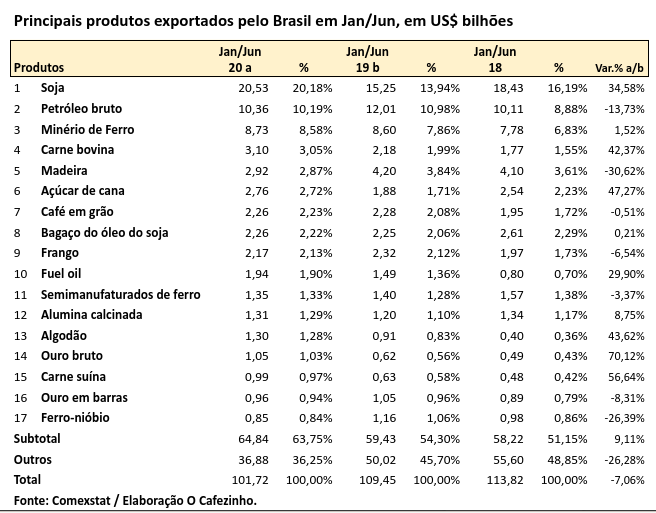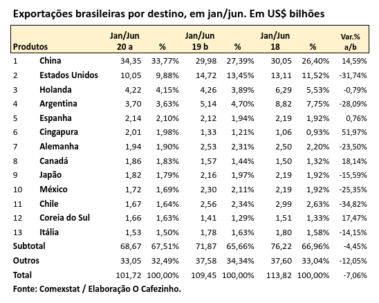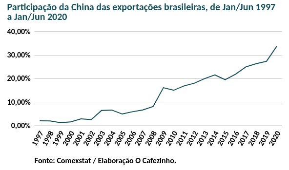 Em jan/jun de 2020, a China respondeu por 34% de nossas exportações, segundo o Comexstat, banco de dados dinâmico do governo brasileiro.