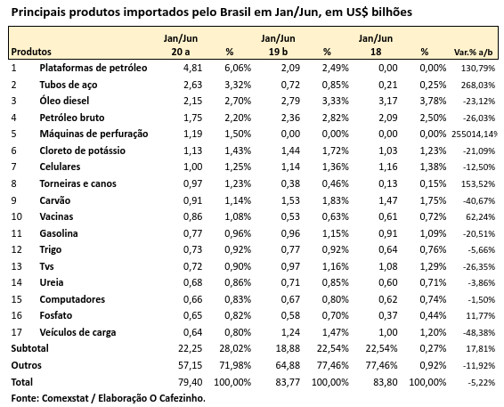 Gastamos outros US$ 2,15 bilhões (em jan/jun) com a importação de diesel, mas US$ 1,1 bilhão com máquinas de perfuração. Se somarmos a importação de gasolina, ureia (usado para fertilizantes), o superávit da nossa balança comercial de petróleo é quase nulo.