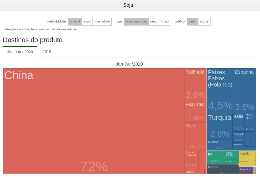 Segundo o Comexstat, a China foi o destino de mais de 70% da soja brasileira exportada no primeiro semestre.