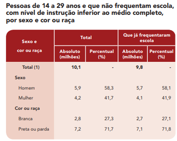 Dos 10 milhões de jovens brasileiros entre 14 e 29 anos que deixaram de frequentar a escola sem completar a educação básica, 71,7% são pretos ou pardos.