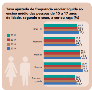 Os dados da taxa de frequência escolar líquida, ou seja, de jovens de 15 a 17 anos que estão no ensino médio (etapa adequada para a idade) continua avançando, mas ainda está em 71,4%. Há desigualdades entre os grupos da população. Enquanto a taxa chega a 76,4% entre as mulheres, está em 66,7% entre os homens. Para os brancos está em 79,6% e 66,7%, para negros.