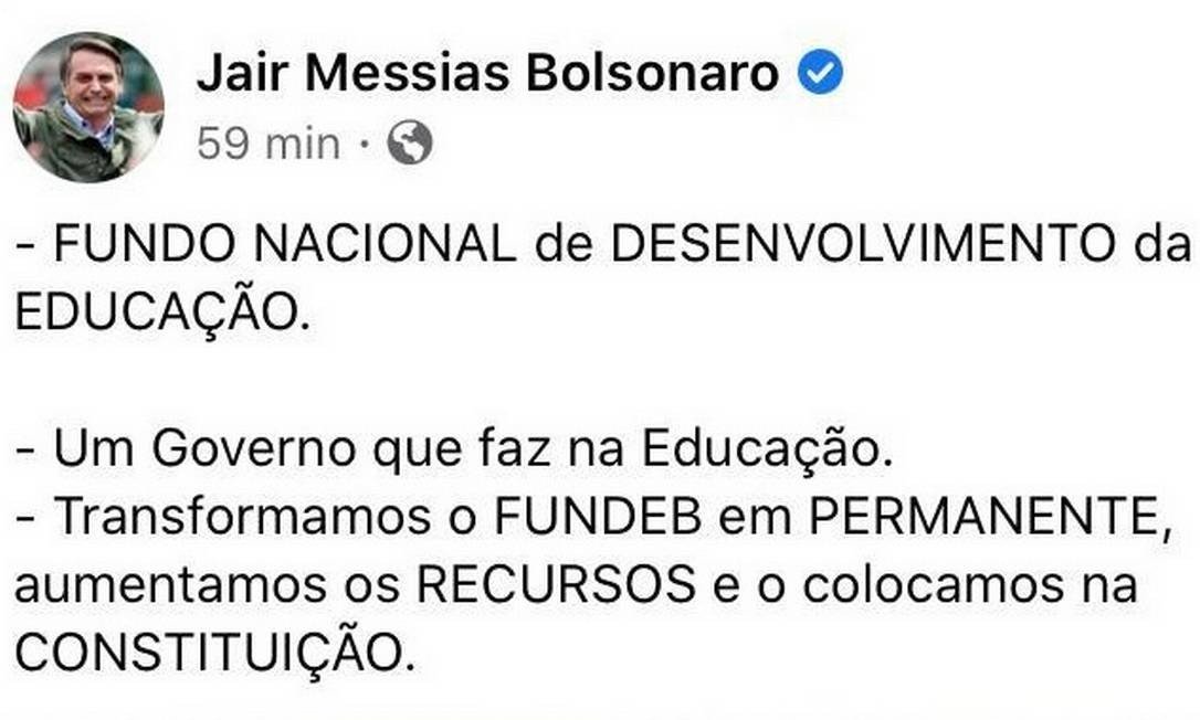 Ainda assim, o presidente celebrou a aprovação do Fundeb na Câmara e atribuiu a seu governo a responsabilidade pelo feito.