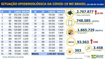 Agência Brasil — O Brasil registrou, desde o início da pandemia, 2,70 milhões de pessoas infectadas pelo covid-19, segundo balanço divulgado neste sábado (1º) pelo Ministério das Saúde. O número é 45,4 mil maior do que o divulgado no levantamento anterior. O número atualizado de recuperados está em 1,86 milhão. Há ainda 748,59 mil pacientes sendo acompanhados.