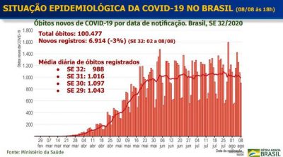A curva das mortes por covid-19 oscilou no mesmo patamar (3% para baixo), totalizando 6.914 novos registros. Na análise das médias diárias de óbitos, foram 988 na 32ª semana epidemiológica contra 1.016 na anterior.