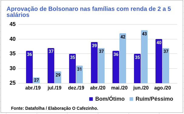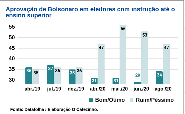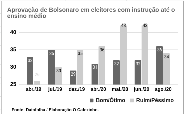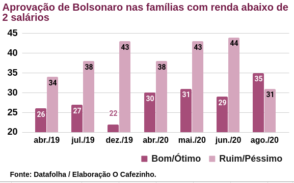A novidade maior, todavia, está entre os mais pobres, entre os quais a aprovação do governo Bolsonaro atingiu um nível até então nunca visto desde o início de seu mandato: 35% de aprovação. A rejeição de Bolsonaro também atingiu um mínimo, de 31%.