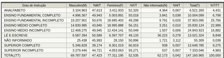 Números igualmente impressionantes são vistos entre os eleitores com instrução até o ensino fundamental, que representam a maioria da população. Segundo os dados do TSE, os eleitores classificados como “analfabetos, ensino fundamental completo, ensino fundamental incompleto, e ensino médio incompleto” totalizam quase 80 milhões de eleitores, ou seja, mais da metade do eleitorado. Eleitores com ensino médio completo representam 23% do eleitorado, e com superior completo ou incompleto, 14% do eleitorado.
